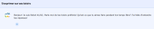 Les loisirs : En cliquant ici vous allez lancer le robot qui après vous avoir demandé votre prénom, vous posera des questions sur vos loisirs. Vous dialoguerez avec lui par écrit en écrivant en bas de l’écran (vous pouvez aussi utiliser l’audio pour « écouter » ses questions). N’hésitez pas sur l’orthographe, s’il voit des fautes, il les corrigera. Bonne discussion !!!