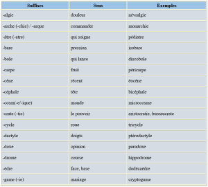 Vous regarderez attentivement le tableau ci-dessous qui recense les suffixes les plus courants et vous ferez l’exercice suivant en vous aidant des exemples proposés :